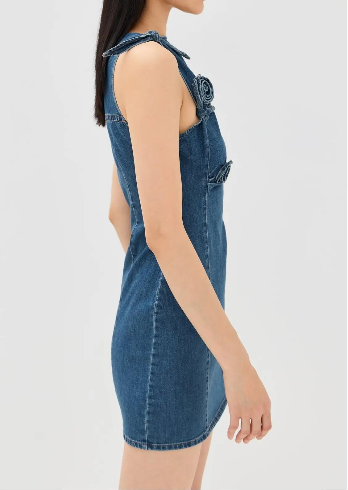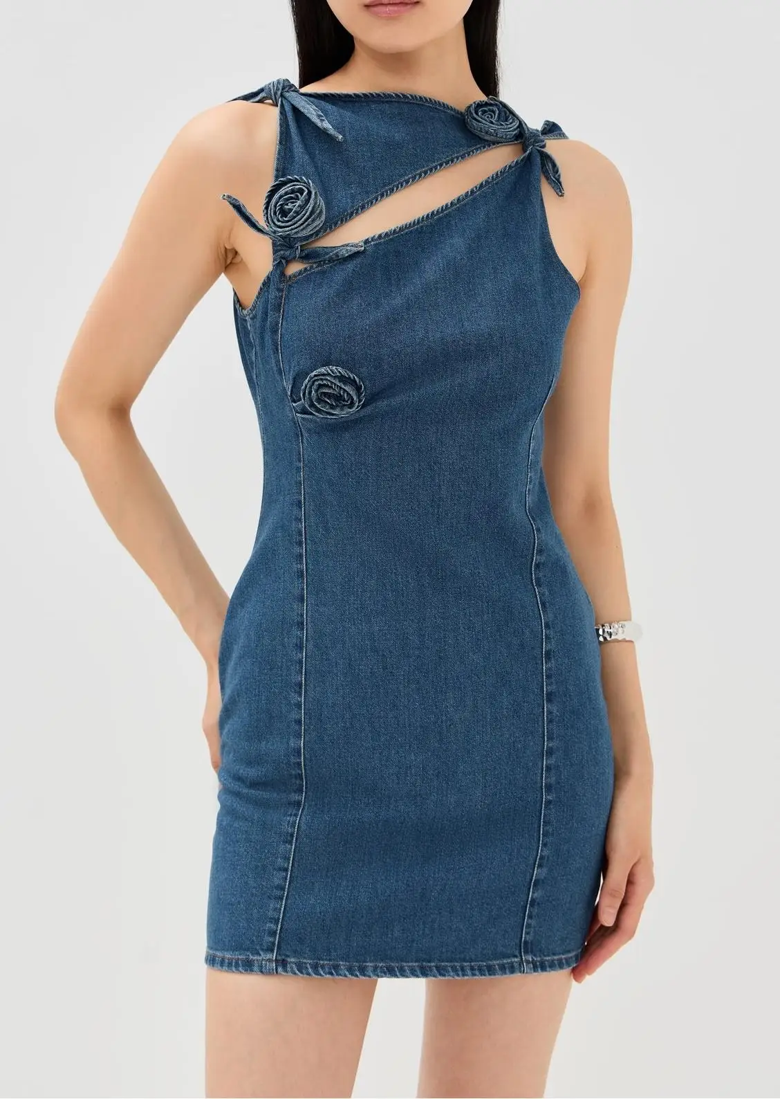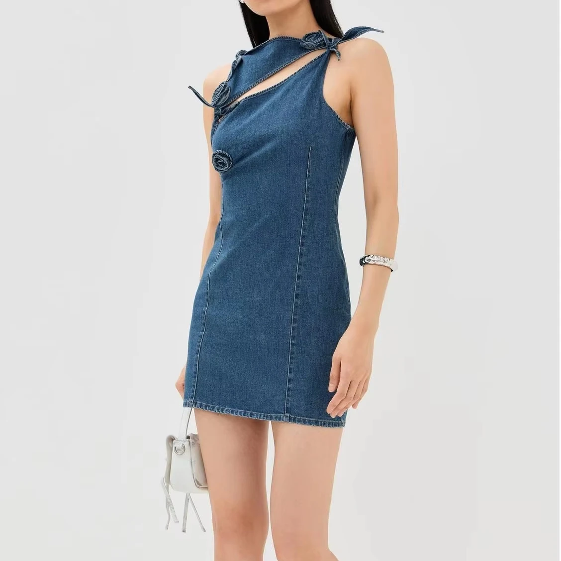 Custom High Quality Women's Denim Short Dress with Bow Decoration Bodycon Hollow Out Elegant Summer Mini Dresses Jeans Ladies